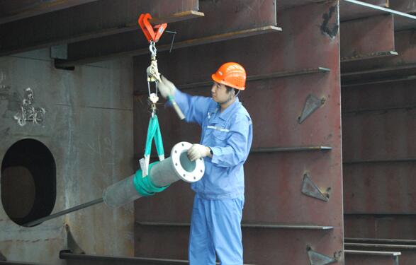 大船纖維吊帶與手扳葫蘆合力固定管材位置,利于平衡工作。